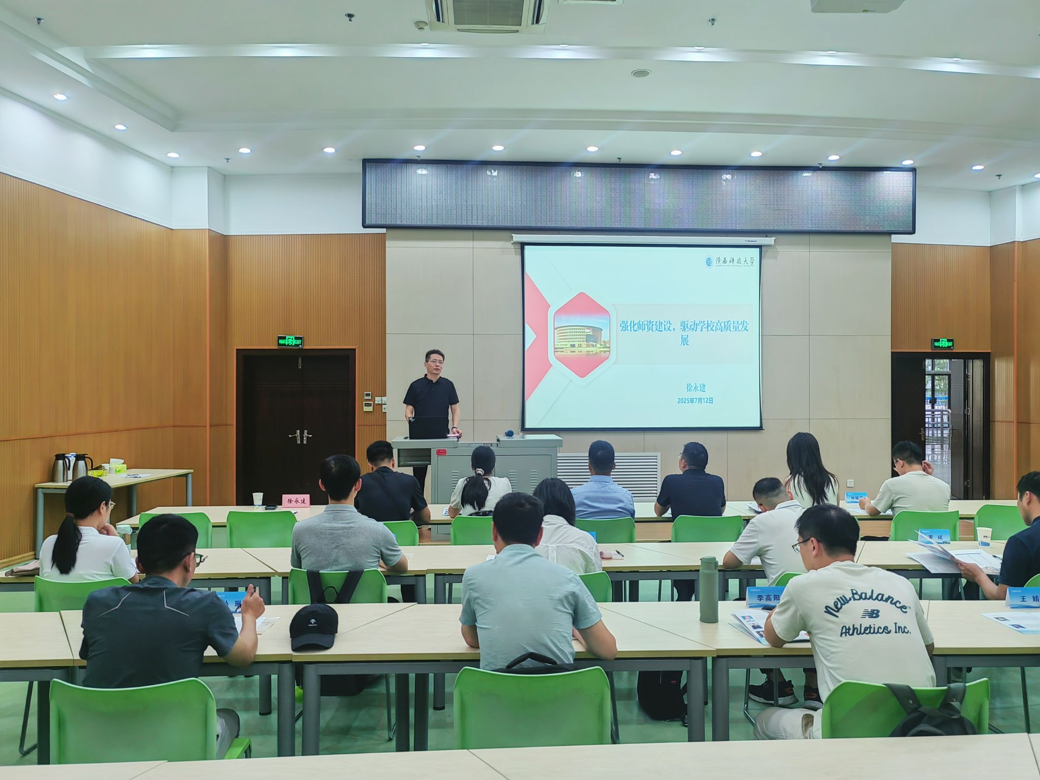 教師發(fā)展中心常務(wù)副主任徐永建作題為《強(qiáng)化師資隊(duì)伍建設(shè),驅(qū)動(dòng)學(xué)校高質(zhì)量發(fā)展》開班動(dòng)員講話。報(bào)告立足新時(shí)代教育強(qiáng)國(guó)建設(shè)背景,從教育、科技、人才“三位一體”戰(zhàn)略高度,深入分析師資隊(duì)伍建設(shè)的戰(zhàn)略意義,詳細(xì)解讀了學(xué)校“三步走”發(fā)展規(guī)劃,系統(tǒng)闡述“至誠(chéng)計(jì)劃”、“至博計(jì)劃”、“卓越計(jì)劃”等教師培養(yǎng)體系的具體舉措與實(shí)施成效,為新進(jìn)教師職業(yè)發(fā)展指明方向。
