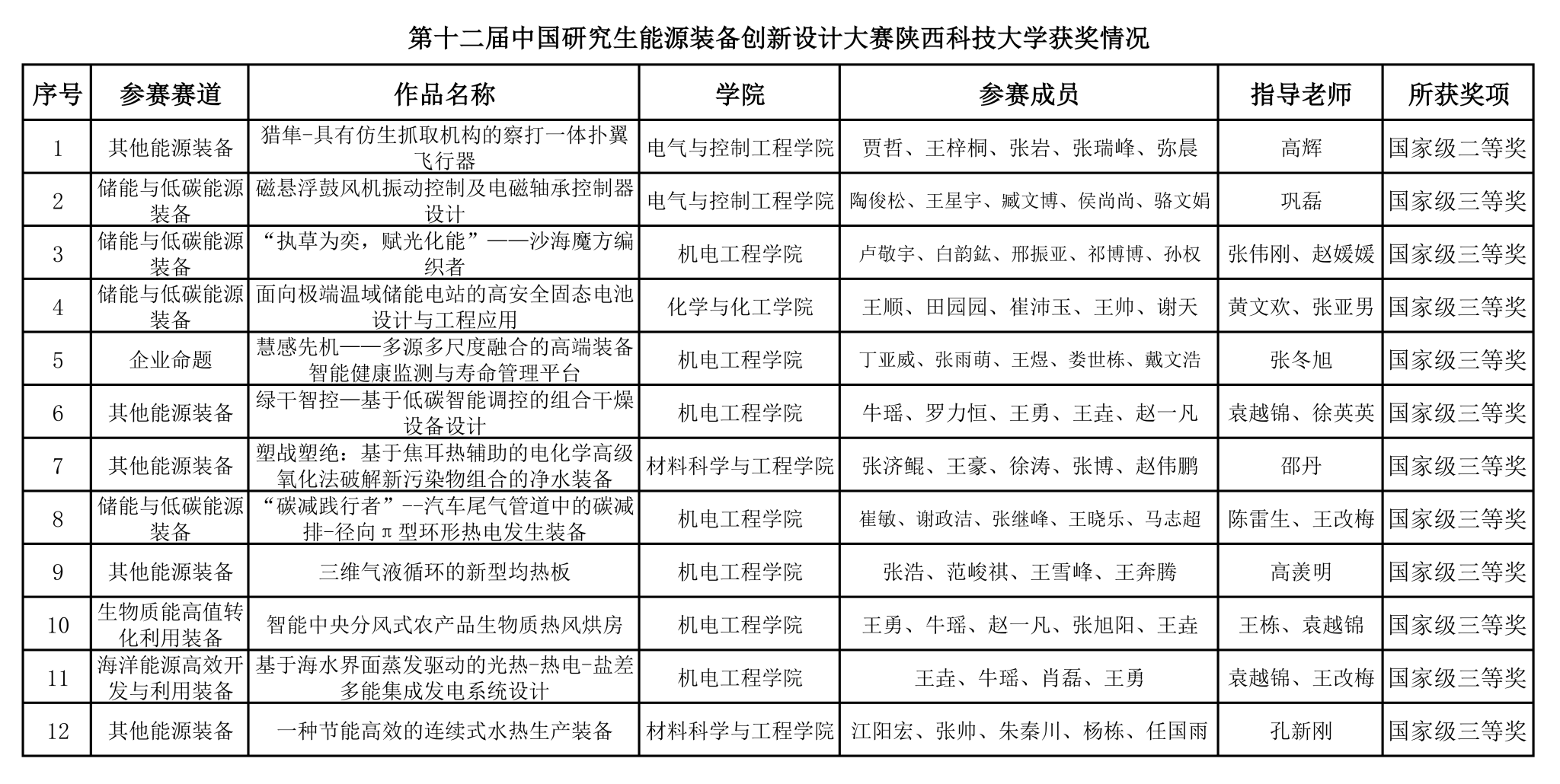 本屆大賽突出綠色導(dǎo)向、工程導(dǎo)向與產(chǎn)業(yè)導(dǎo)向,全面升級(jí)賽題與配套活動(dòng),打造服務(wù)國(guó)家能源安全和“雙碳”戰(zhàn)略的重要實(shí)踐平臺(tái)。全國(guó)共有309個(gè)培養(yǎng)單位的2435支團(tuán)隊(duì)參賽,經(jīng)專(zhuān)家函評(píng),745支隊(duì)伍晉級(jí)決賽。我校10支隊(duì)伍參加決賽,經(jīng)過(guò)展板展示、現(xiàn)場(chǎng)答辯和評(píng)審,共獲12項(xiàng)國(guó)家級(jí)獎(jiǎng)項(xiàng),彰顯了在新能源領(lǐng)域的科研實(shí)力與人才培養(yǎng)成效,展現(xiàn)了陜科大學(xué)子科技報(bào)國(guó)、助力輕工強(qiáng)國(guó)建設(shè)的使命擔(dān)當(dāng)和勇于創(chuàng)新的時(shí)代風(fēng)貌。