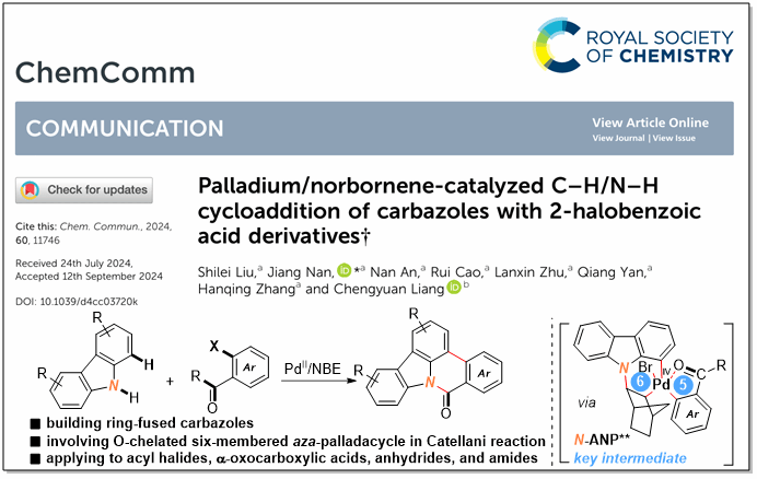 傳統(tǒng)的Catellani反應(yīng)從最初的芳基碘化物通過金屬鈀(0)與NBE的五元鈀雜環(huán)協(xié)同催化,將C-H活化、偶聯(lián)反應(yīng)與降冰片烯的遷移插入巧妙結(jié)合,在單一步驟中完成芳環(huán)上官能團(tuán)的引入。南江團(tuán)隊(duì)發(fā)展了一種鈀/降冰片烯(NBE)以六元鈀雜環(huán)參與轉(zhuǎn)化的協(xié)同催化體系,成功實(shí)現(xiàn)了2-溴苯甲酸與咔唑類化合物的C-H/N-H環(huán)加成反應(yīng)。該工作不僅拓展了Catellani反應(yīng)底物的多樣性,更從機(jī)理層面豐富了過渡金屬催化劑鈀物種的多樣性。該工作以“Palladium/norbornene-catalyzed C–H/N–Hcycloaddition of carbazoles with 2-halobenzoic acid derivatives”為題為題發(fā)表在自然指數(shù)期刊Chemical Communications上,實(shí)驗(yàn)工作主要由2023級(jí)博士生劉石磊完成。