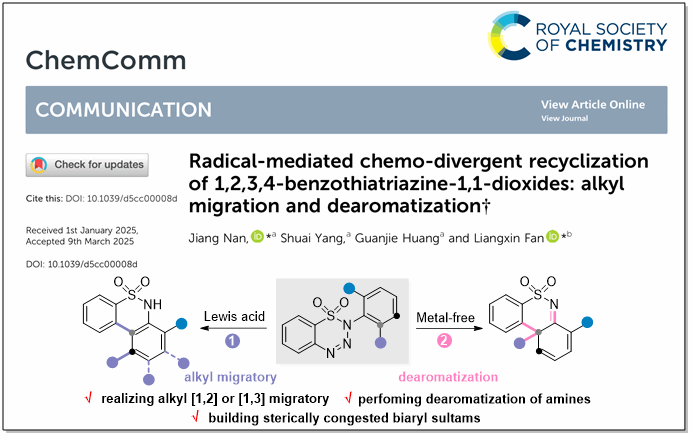 受熵不利的過渡態(tài)和σ-π超共軛效應(yīng)的影響,芳基C(sp2)-烷基重排的策略相對(duì)有限。南江團(tuán)隊(duì)通過創(chuàng)新自由基介導(dǎo)策略,成功實(shí)現(xiàn)苯并噻嗪氧化物脫氮?dú)猸h(huán)化轉(zhuǎn)化新方法。該工作突破傳統(tǒng)芳基重排反應(yīng)限制,開發(fā)出新型芳基C(sp2)-烷基遷移路徑,高效合成傳統(tǒng)方法難以制備的大位阻二苯并磺酰胺類化合物;同步通過條件調(diào)控實(shí)現(xiàn)苯并噻嗪氧化物去芳構(gòu)化轉(zhuǎn)化,精準(zhǔn)構(gòu)筑含全取代季碳中心的新型分子骨架。相關(guān)成果以“Radical-mediated chemo-divergent recyclization of 1,2,3,4-benzothiatriazine-1,1-dioxides: alkyl migration and dearomatization”為題發(fā)表在自然指數(shù)期刊Chemical Communications上,實(shí)驗(yàn)工作主要由2022級(jí)碩士生楊帥完成。
