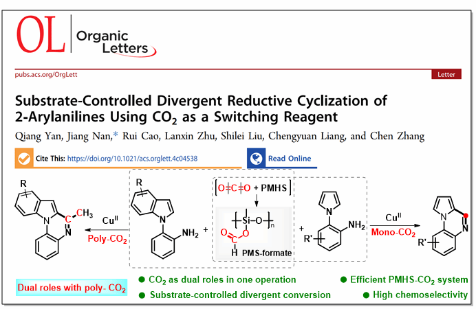 利用CO2作為“碳源”在有機(jī)合成轉(zhuǎn)化領(lǐng)域備受關(guān)注,尤其是在雙分子CO2轉(zhuǎn)化方面存在諸多挑戰(zhàn)。南江團(tuán)隊(duì)利用Cu-PMHS的還原體系,通過精準(zhǔn)調(diào)控底物結(jié)構(gòu)首次實(shí)現(xiàn)了CO2在單一反應(yīng)中的雙重角色。對(duì)于2-吲哚苯胺,CO2通過雙分子還原參與反應(yīng),高效構(gòu)建了含甲基的喹喔啉衍生物;而2-吡咯苯胺則選擇性地捕獲單分子CO2,生成結(jié)構(gòu)多樣的喹喔啉類化合物。該策略創(chuàng)新性揭示了底物結(jié)構(gòu)與雙甲酰化中間體形成對(duì)反應(yīng)選擇性的關(guān)鍵調(diào)控作用,為CO2的多樣性轉(zhuǎn)化提供了新思路。該工作以“Substrate-Controlled Divergent Reductive Cyclization of 2Arylanilines Using CO2 as a Switching Reagent”為題發(fā)表在有機(jī)化學(xué)領(lǐng)域國際知名期刊Organic Letters上,實(shí)驗(yàn)工作主要由2022級(jí)博士生閆強(qiáng)完成。