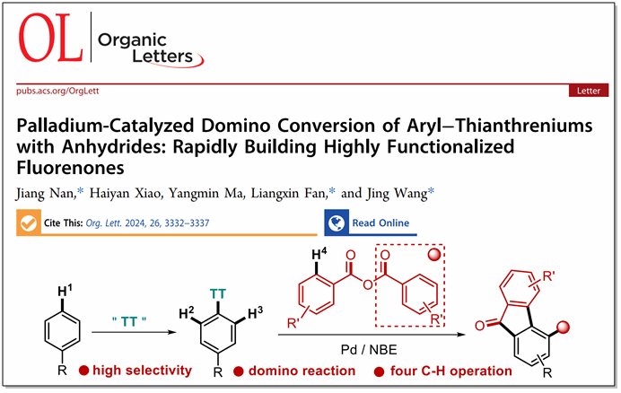 Catellani反應(yīng)被廣泛視為一種構(gòu)建復(fù)雜有機(jī)分子的強(qiáng)大手段,并因此引發(fā)了持續(xù)的關(guān)注與研究。與此同時(shí),作為一類新興的親電偶聯(lián)試劑,芳基噻蒽鹽(aryl-TTs)亦在近年來吸引了眾多學(xué)者的密切關(guān)注。南江教授團(tuán)隊(duì)發(fā)展了一種鈀催化的芳基噻蒽鹽與酸酐多米諾環(huán)化反應(yīng)新策略,可高效構(gòu)建一系列高度官能團(tuán)化的芴酮,首次揭示了芳基噻蒽鹽作為偶聯(lián)試劑的多米諾環(huán)化反應(yīng)模式,拓展了其反應(yīng)類型。該工作以“Palladium-Catalyzed Domino Conversion of Aryl?Thianthreniums with Anhydrides: Rapidly Building Highly Functionalized Fluorenones”為題發(fā)表在有機(jī)化學(xué)領(lǐng)域國際著名期刊Organic Letters上,實(shí)驗(yàn)工作主要由2021級(jí)碩士生肖海燕完成。