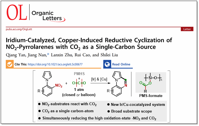 在有機(jī)合成領(lǐng)域,CO2與硝基化合物(-NO?)的反應(yīng)面臨嚴(yán)峻挑戰(zhàn),主要由于CO2熱力學(xué)穩(wěn)定難以活化,硝基則在強(qiáng)還原條件下才能轉(zhuǎn)化為胺。南江團(tuán)隊(duì)在前期工作基礎(chǔ)上發(fā)展了一種以CO2作為單一碳源與硝基化合物的催化轉(zhuǎn)化新方法。該催化過程巧妙采用PMHS作為還原劑,在一次操作中同時(shí)實(shí)現(xiàn)了最高氧化態(tài)硝基和CO2的雙重還原。詳盡的機(jī)理研究表明,銥催化劑在還原NO2部分中起著至關(guān)重要的作用,而銅催化劑在后續(xù)的甲?;襟E和C?H環(huán)化步驟中具有雙重功能。該工作以“Iridium-Catalyzed, Copper-Induced Reductive Cyclization of NO2Pyrrolarenes with CO2 as a Single-Carbon Source”為題發(fā)表在有機(jī)化學(xué)領(lǐng)域國際知名期刊Organic Letters上,實(shí)驗(yàn)工作主要由2022級(jí)博士生閆強(qiáng)完成。