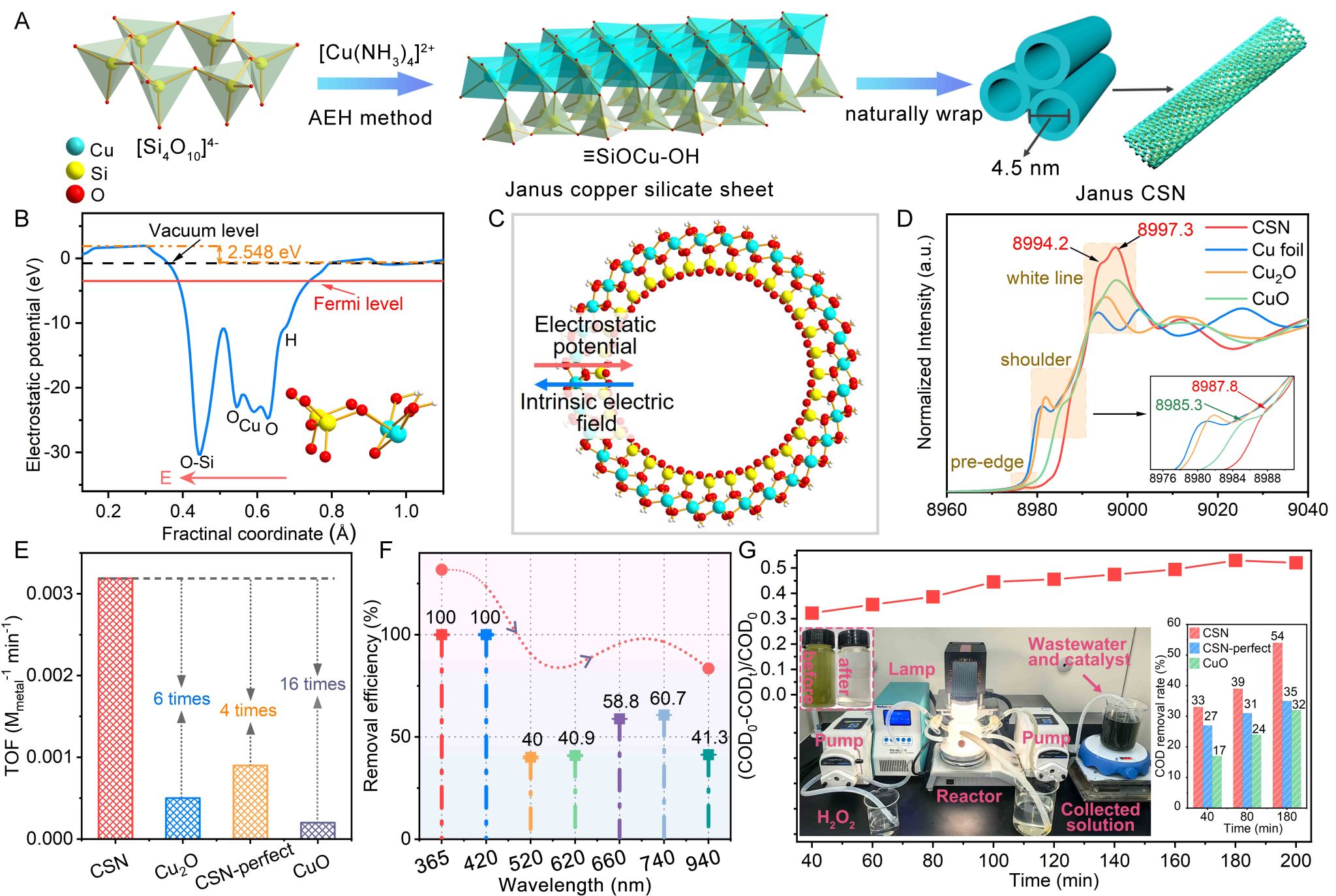 為了克服上述挑戰(zhàn),陜西科技大學(xué)王蘭教授團隊提出了一種非對稱結(jié)構(gòu)設(shè)計策略,構(gòu)建了Janus硅酸銅納米管(CSN)并誘導(dǎo)產(chǎn)生了富電子Cu(Ⅰ)和氧空位缺陷(Vo)位點,實現(xiàn)了有效的全光譜驅(qū)動光芬頓催化。該研究發(fā)現(xiàn),Vo和CuO6八面體結(jié)構(gòu)的共存使得CSN獲得了優(yōu)異的全光譜光響應(yīng)能力;不對稱結(jié)構(gòu)所產(chǎn)生的固有內(nèi)建電場極大地促進(jìn)了光生載流子的空間分離和光生電子的定向轉(zhuǎn)移;Cu(Ⅰ)位點附近的Vo充當(dāng)電子陷阱位點,將光生電子富集到其鄰近的Cu位點,加速了Cu(Ⅱ)/Cu(Ⅰ)的氧化還原循環(huán),這充分利用了光激發(fā)電子“自我補充”來補償Cu(Ⅰ)位點的給電子能力并實現(xiàn)了H2O2的持續(xù)活化。