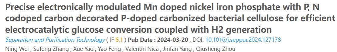 并且,本研究團隊以細菌纖維素為基材,以Mn摻雜NiFe-PBA為前驅(qū)體,通過一步碳化-磷酸化方法制備了嵌入P、N共摻雜碳基底并直接在P摻雜CBC(MNFP-PNC/PCBC) 表面生長的PBA衍生的Mn摻雜磷酸鎳鐵,用于電催化葡萄糖轉(zhuǎn)化與制氫耦,MNFP-PNC/PCBC的精確電子調(diào)制和結(jié)構(gòu)設(shè)計增強了催化劑的內(nèi)稟活性和暴露活性位點的數(shù)量,并通過錨定納米活性材料提供了優(yōu)異的導(dǎo)電性和穩(wěn)定性。在葡萄糖存在的情況下,只需1.55 V的低電位即可達到50 mA cm?2的電流密度。有趣的是,這種耦合系統(tǒng)在陰極有效地生成了氫氣,而陽極葡萄糖轉(zhuǎn)化率的增加導(dǎo)致葡萄糖轉(zhuǎn)化率達到97%,甲酸鹽的產(chǎn)率為79.5%,法拉第效率為86.1%。這項工作為開發(fā)高催化活性生物質(zhì)電催化轉(zhuǎn)化耦合制氫電催化劑開辟了新的前景,通過結(jié)構(gòu)工程和電子調(diào)制具有廣泛的應(yīng)用可能性。相關(guān)研究成果以“Precise electronically modulated Mn doped nickel iron phosphate with P, N codoped carbon decorated P-doped carbonized bacterial cellulose for efficient electrocatalytic glucose conversion coupled with H2 generation”為題發(fā)表在國際期刊Separation and Purification Technology(文章鏈接:https://doi.org/10.1016/j.seppur.2024.127178)。