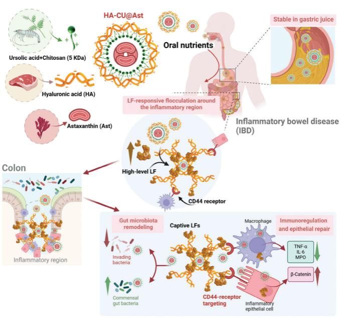 炎癥性腸?。↖BD)是一種慢性腸道炎癥疾病,傳統(tǒng)口服藥物常因腸道黏膜損傷和腹瀉導(dǎo)致藥物無法有效滯留于炎癥區(qū)域,嚴重限制療效。盡管納米遞送系統(tǒng)可改善藥物溶解度,但非特異性釋放和過早泄露問題仍亟待解決。針對這一問題,楊金帆副教授合作者提出一種基于天然營養(yǎng)素蝦青素,殼寡糖和透明質(zhì)酸的口服精準納米遞送系統(tǒng)(HA-CU@Ast)。通過智能識別炎癥區(qū)域乳鐵蛋白高表達特征觸發(fā)納米顆粒絮凝,結(jié)合透明質(zhì)酸靶向病灶高表達CD44受體的雙重機制,實現(xiàn)蝦青素在腸道炎癥部位的精準錨定,顯著提升蝦青素的溶解度(513倍)及抗氧化活性。動物實驗顯示,治療組IBD小鼠存活率達100%,結(jié)腸長度恢復(fù)至健康水平,促炎因子(TNF-α、IL-6)降低,腸道菌群有害菌減少且益生菌豐度顯著恢復(fù)。該策略以天然可食用材料構(gòu)建,兼具高效性與安全性,為IBD及其他炎癥疾病的精準治療開辟新路徑。(文章鏈接:https://pubmed.ncbi.nlm.nih.gov/39722174/DOI: 10.1002/adhm.202402731)