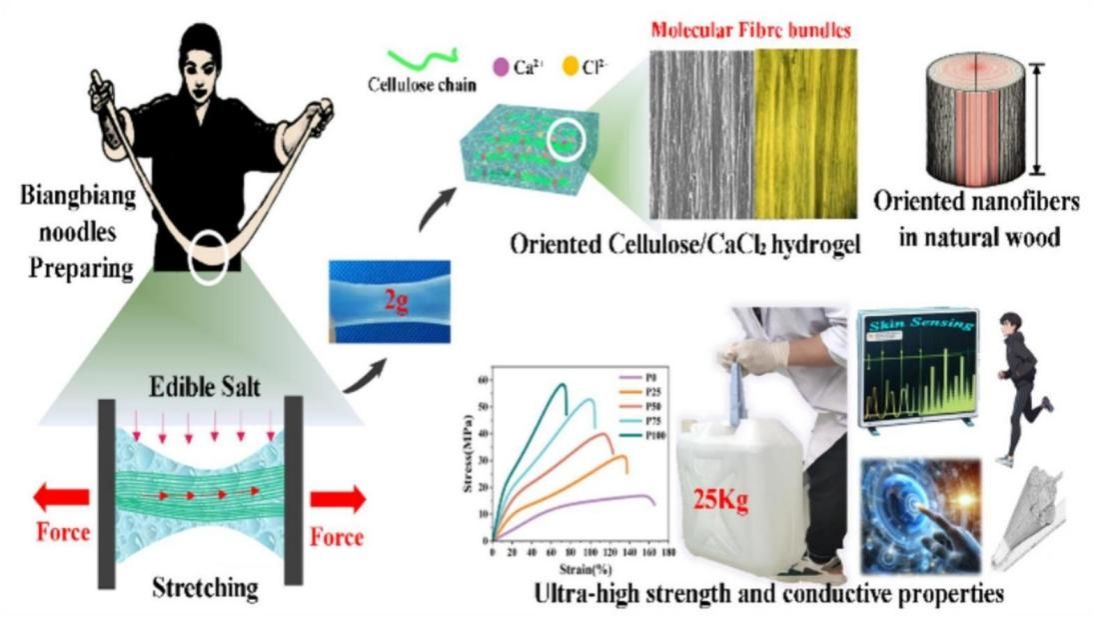 本團隊研究了一種通過定向預(yù)拉伸和溶劑置換結(jié)合制備超強超韌導(dǎo)電水凝膠的策略,成功地模擬了纖維在木材中的定向排列,減少了相鄰區(qū)域之間的平均距離,并大大提高了水凝膠的力學(xué)性能。然后引入金屬離子以形成金屬離子配位鍵,從而實現(xiàn)各種特性的多功能耦合,包括高拉伸應(yīng)變、保水性、導(dǎo)電性和抗凍性。水凝膠具有優(yōu)異的機械性能,具有極高的拉伸強度(52.79 ± 0.24 MPa)、楊氏模量(287 ± 20 MPa)、斷裂韌性(34.41 ± 2.89 MJ m?3)、斷裂應(yīng)變(104.6 ± 2 %)和離子電導(dǎo)率(11.73 ± 0.06 mS m?1),在?80 °C下冷凍7天后,力學(xué)性能和電導(dǎo)率保持與冷凍前相同的水平。其出色的多功能性可應(yīng)用于需要高強度且在極端環(huán)境中作的機器人軟組織(如跟腱)。相關(guān)研究成果以“Ultra-strong and tough cellulose-based conductive hydrogels via orientation inspired by noodles pre-stretching”為題發(fā)表在國際期刊Carbohydrate Polymers(文章鏈接:https://doi.org/10.1016/j.carbpol.2024.122286)。