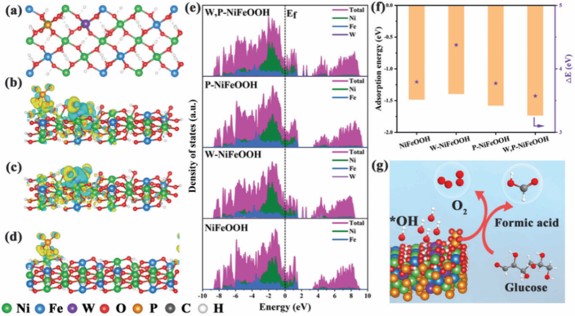 本團隊以NiFe基金屬有機框架(MOF)為前驅(qū)體,通過離子交換和磷酸化制備W摻雜磷化鎳鐵(W-NiFeP)納米片陣列,其對析氫反應(yīng)(HER)表現(xiàn)出高電催化活性,具有僅-179 mV的過電位,在堿性介質(zhì)中可實現(xiàn)100 mA cm?2的電流密度,W-NiFeP的電化學(xué)活化促進了磷酸基團的原位形成,產(chǎn)生W,P-NiFeOOH。這項工作的結(jié)果突出了開發(fā)用于生物質(zhì)電催化轉(zhuǎn)化的有效電催化劑在構(gòu)建用于綠色氫氣生產(chǎn)的高效電解槽中的重要性。相關(guān)研究成果以“In Situ Modulation of NiFeOOH Coordination Environment for Enhanced Electrocatalytic-Conversion of Glucose and Energy-Efficient Hydrogen Production”為題發(fā)表在國際期刊Advanced Science(文章鏈接:https://doi.org/10.1002/advs.202412872)。