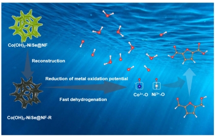 團隊開發(fā)出一種通過電化學重構(gòu)制備的高效電催化劑Co(OH)2-NiSe@NF-R,成功實現(xiàn)5-羥甲基糠醛(HMF)電催化氧化制備2,5-呋喃二甲酸(FDCA)的高選擇性轉(zhuǎn)化。研究團隊通過設計Co(OH)2-NiSe@NF前驅(qū)體,在堿性介質(zhì)中經(jīng)電化學重構(gòu)形成富含高價活性位點(CoOOH和NiOOH)的催化劑表面。研究揭示了Co(OH)2-NiSe@NF重構(gòu)機理:重構(gòu)過程中硒元素被氧化為硒酸鹽(SeO42-)并附著于氫氧化物表面,通過降低晶格羥基脫氫能壘,促進高價金屬活性位點的形成。該工作以“Revealing the electrochemical reconstruction behavior of Co(OH)2-NiSe for efficient the electrooxidation of 5-hydroxymethylfurfural”為題發(fā)表在《Chemical Engineering Journal》。23級博士生朱嘉琦為第一作者,王偉濤副教授、劉昭鐵教授和韓布興研究員為通訊作者。