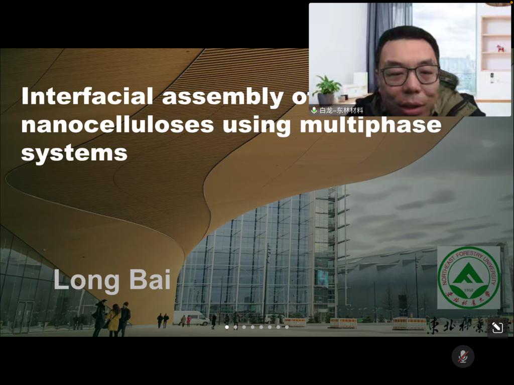 11月4日下午,應(yīng)我校輕工科學(xué)與工程學(xué)院(柔性電子學(xué)院)、科技處及前沿院邀請(qǐng),東北林業(yè)大學(xué)白龍教授做客我?!扒把乜茖W(xué)報(bào)告”,作了題為“納米纖維素非均相體系制造與應(yīng)用”的線上學(xué)術(shù)報(bào)告。報(bào)告會(huì)由輕工學(xué)院副院長(zhǎng)劉國(guó)棟主持,學(xué)院教師和全體研究生聆聽(tīng)了此次報(bào)告會(huì)。