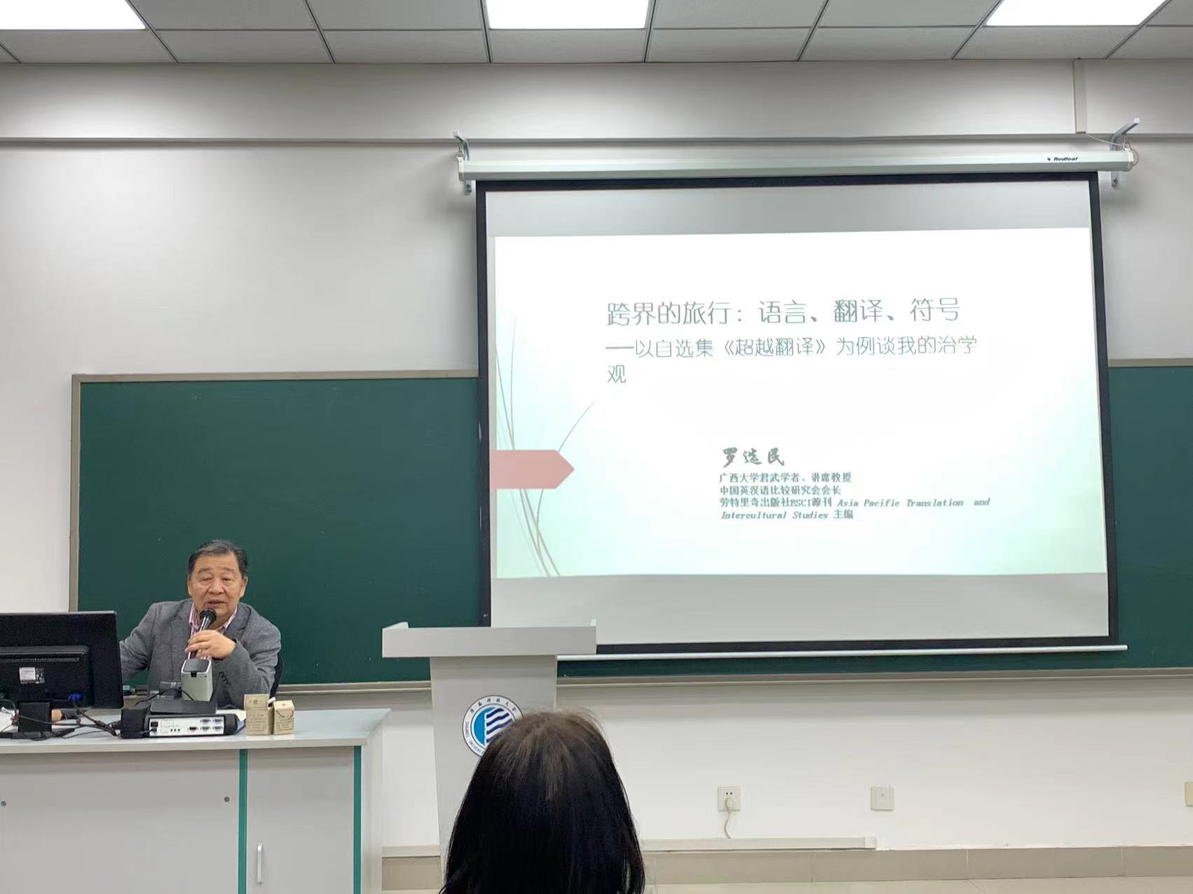 5月25日,廣西大學(xué)武君學(xué)者、博士生導(dǎo)師羅選民教授應(yīng)我校文理學(xué)院邀請,為全體MTI學(xué)生和外語教師做了主題為“跨界的旅行:語言、翻譯、符號——以自選集《超越翻譯》為例談?wù)勎业闹螌W(xué)觀”的學(xué)術(shù)報告,拉開了我校5月26-28日即將承辦的語言服務(wù)研究國際學(xué)術(shù)會議的序幕,報告由文理學(xué)院外語學(xué)科特聘教授司顯柱主持。