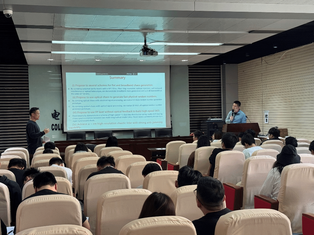 報(bào)告結(jié)束后,李璞教授與現(xiàn)場(chǎng)參會(huì)的師生們圍繞混沌光學(xué)及相關(guān)領(lǐng)域的專業(yè)問題展開了熱烈而深入的探討。面對(duì)師生們踴躍提出的疑問,李璞教授以極大的熱情和耐心,逐一給予了詳盡且富有啟發(fā)性的解答。此次學(xué)術(shù)分享不僅極大地拓寬了師生們的學(xué)術(shù)視野,使大家對(duì)混沌光學(xué)在現(xiàn)代科技中的重要地位有了更為深刻的認(rèn)識(shí),同時(shí)也為相關(guān)領(lǐng)域的研究工作提供了新的思路與方向,激發(fā)了師生們對(duì)科學(xué)探索的濃厚興趣。