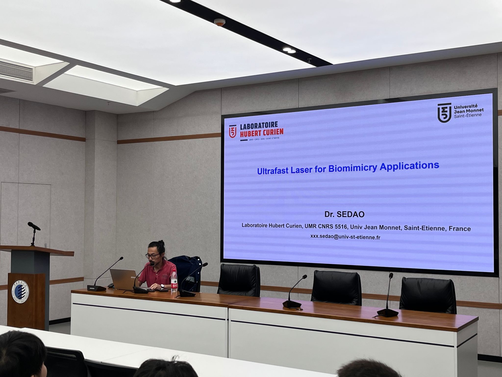 9月1日的報(bào)告中,SEDAO教授以“Ultrafast Laser Processing: Applications Overview”為題,系統(tǒng)講解了超高速激光脈沖與材料的相互作用機(jī)制、表面功能化技術(shù)及工業(yè)化應(yīng)用路線,解析了核心技術(shù)原理與落地路徑,并結(jié)合增材制造、生物醫(yī)學(xué)等實(shí)例,展現(xiàn)了超快激光的廣泛應(yīng)用潛力。3日,他以“Ultrafast Laser for Biomimicry Applications”為題,圍繞仿生學(xué)展開,闡述了仿生學(xué)理念,介紹了自然啟發(fā)表面的功能特性及超快激光紋理化技術(shù),還解析了眼科生物源材料中激光與材料的相互作用等內(nèi)容。5日的“Pulsed-Laser for Direct Coloration of Metals”報(bào)告,闡述了激光與物質(zhì)相互作用原理、金屬表面顏色呈現(xiàn)(含結(jié)構(gòu)色與色素色的區(qū)別)及相關(guān)加工工藝,通過光捕獲黑色表面等實(shí)例體現(xiàn)了應(yīng)用價(jià)值。每場(chǎng)報(bào)告中,教授都與師生深入交流,解答技術(shù)難點(diǎn),引導(dǎo)多學(xué)科交叉思考,幫助師生了解前沿動(dòng)態(tài),對(duì)提升學(xué)校相關(guān)領(lǐng)域國際化交流層次意義重大。